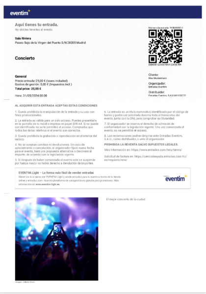 El check-out simplificado hace que el proceso de compra sea especialmente cómodo gracias a los métodos de pago como Bizum y tarjeta de crédito. Después de su compra, tus clientes recibirán una entrada digital imprimible como archivo PDF vía e-mail o también descargándola directamente desde la página de confirmación y añadirla a Google o Apple Wallet.